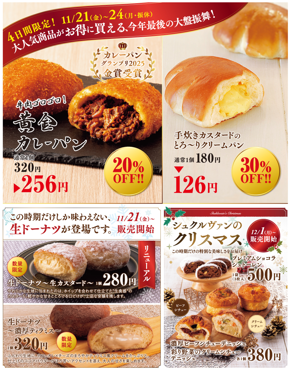 ※11月21日のクリームパン100円の日は休止いたします。