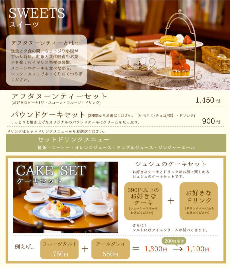 ■ケーキは750円(税込)以下のものの中からお好きなものをお選び頂けます。ドリンク1杯付き。